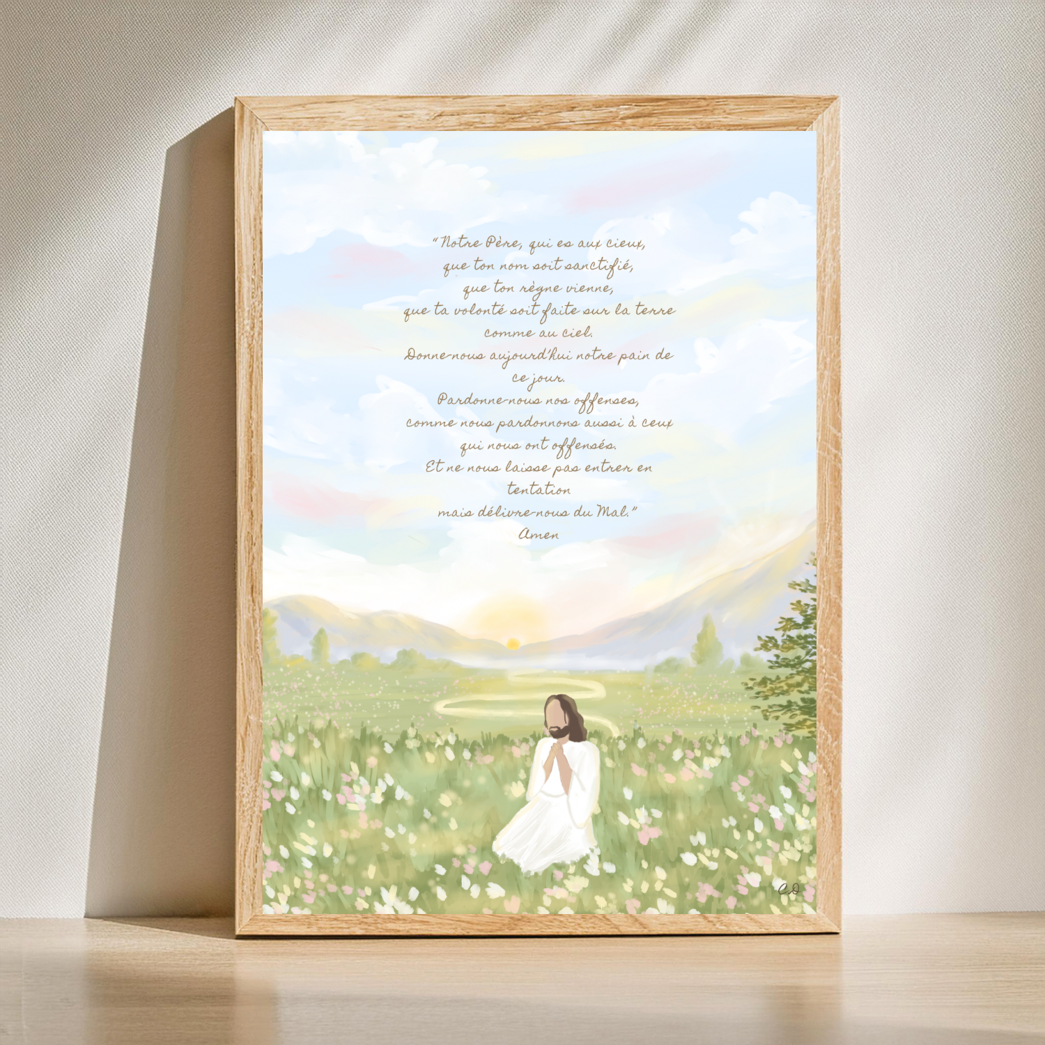 Illustration digitale chrétienne du Notre Père, imprimée sur un papier photo satiné.